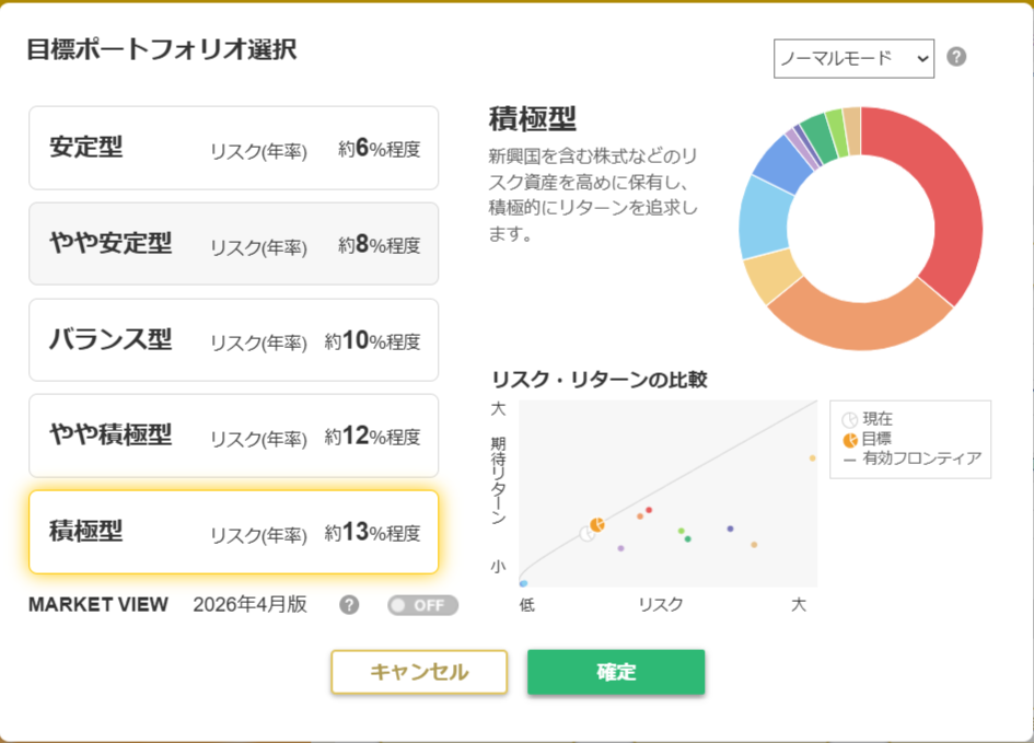 私は現在、**積極型(リスク約13%)**を選択しています。