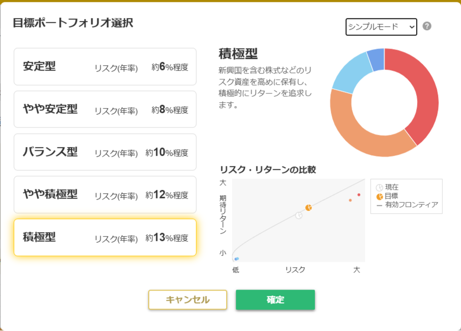 最初の画面左側の「ポートフォリオの目標タイプ」変更ボタンをクリックすると、この画面が出てきます。